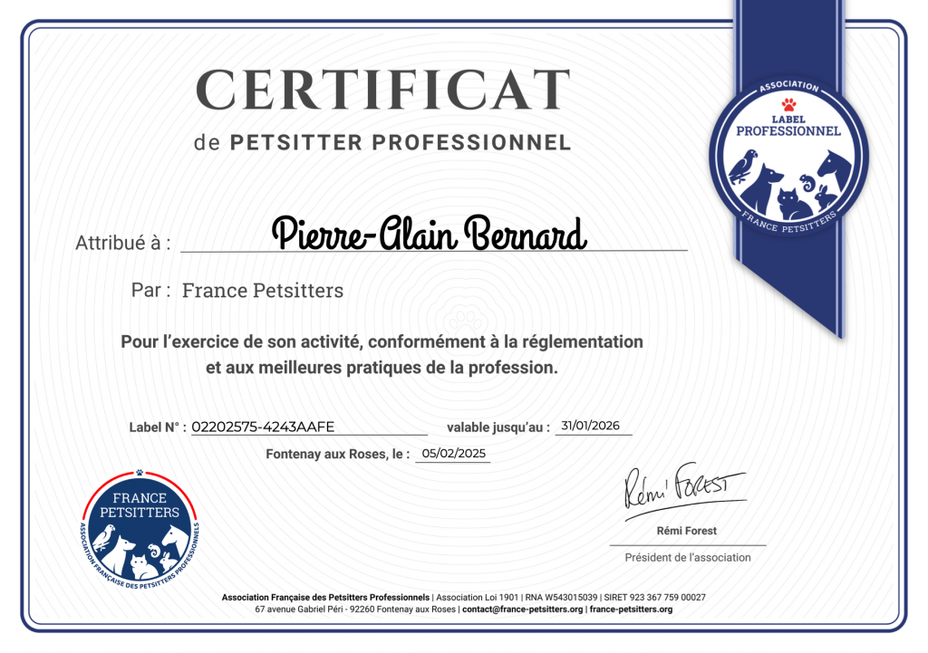 Certifié Petsitter Professionnel Chez France Petsitters.